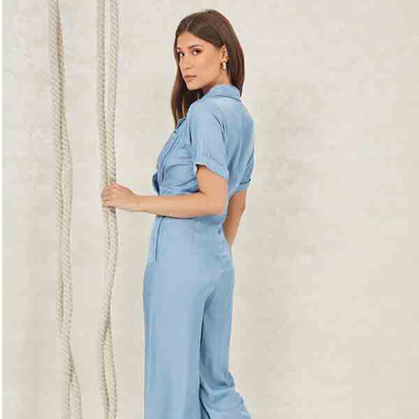 Blue solid basic jumpsuit ,has a shirt collar, short sleeves, na pockets