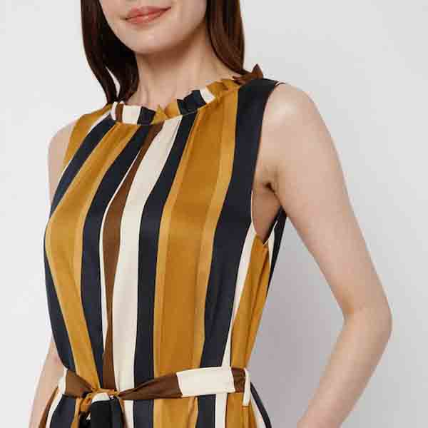 Brown and black striped basic jumpsuit with waist tie-ups ,has a round neck, sleeveless, 2 pockets