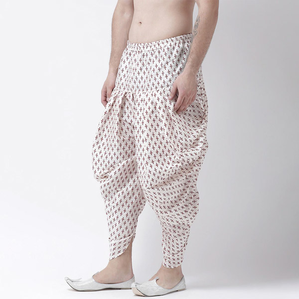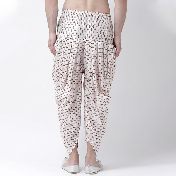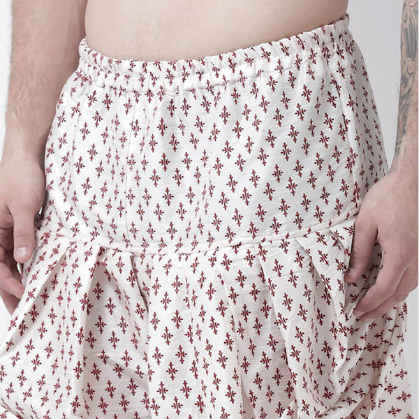 • Off-white and red printed mid-rise dhoti with gathered and pleated detail, has an elasticated waistband