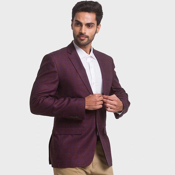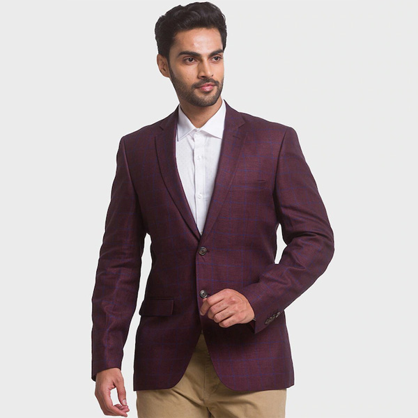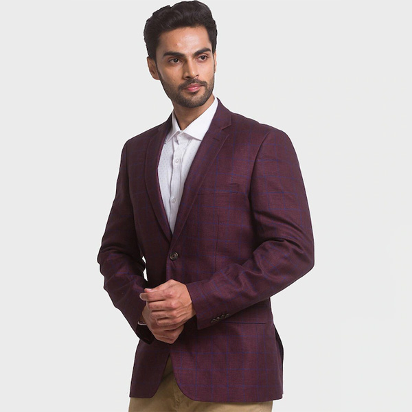 Maroon checked regular-fit blazer, has a notched lapel collar, single-breasted with button closure, long sleeves, one welt pocket, two flap pockets, and double vented back hem.