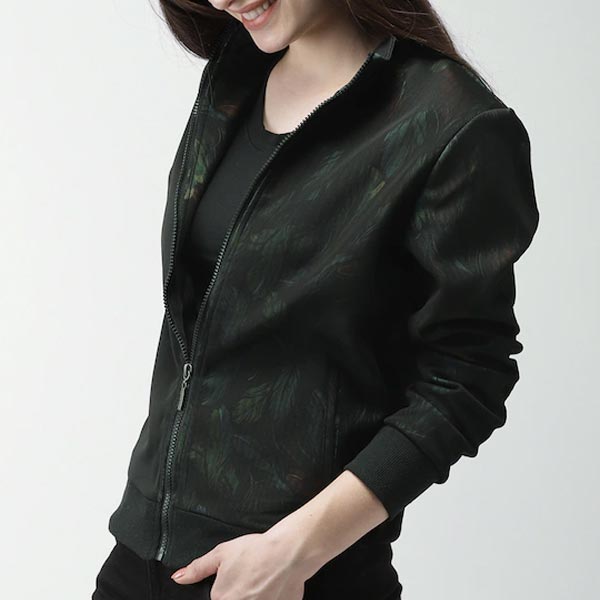 Black and green printed bomber, has a mock collar, two pockets, zip closure, long sleeves, straight hem, unlined lining