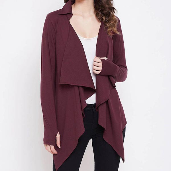 Maroon solid open front regular shrug, has long sleeves, asymmetric hem